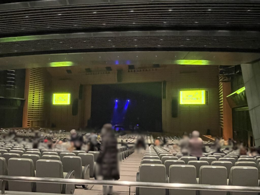 開場時間になり、中へ。僕の席は1階だったが、その前に、ラウンジでビールを1杯。その後ホールの中へ行こうとしたが、エスカレーター脇に大きなポスター(メンバーのサインも書いてあった)があったので、とりあえず写真を撮ってから、エンスカレーターでホールの入り口へ。僕の席は1階とはいえ、真ん中よりやや後ろの方だった。席について開演前の会場の写真を撮ったりしながら、時間を潰した。
